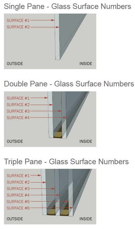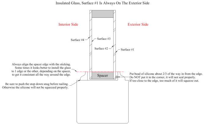 Low-E applications involve depositing a thin, transparent coating of silver or tin oxide on the glass surface to allow short-wavelength sunlight to pass through while blocking long-wavelength heat radiation. You will notice some insulated glass units coming in with labels on them “Glaze This Side In”, or “Glaze This Side Out”. That is a recommendation from the Glass Company, but not a deal beaker or warranty issue. Low-E is usually applied to one of the middle surfaces (2 or 3) to prevent it from getting scratched. Follow the label IF it does not conflict the orientation of installation instructions for beveled or pattern glass specified above.